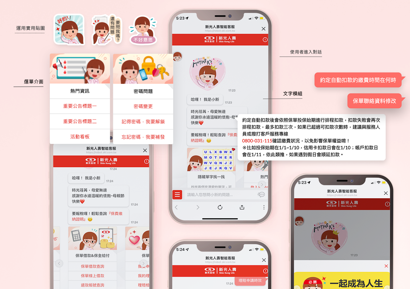 由清楚明瞭的選單介面引導使用者進入對話的模式、運用實用貼圖包擬人化的回答問題、彈跳視窗式的廣告版面不但不佔空間還能與對話功能作出清楚的區分、規劃圖卡模組與文字模組讓操作人員能有更多運用的形態,也讓使用者可以輕鬆理解並得到想要的答案。