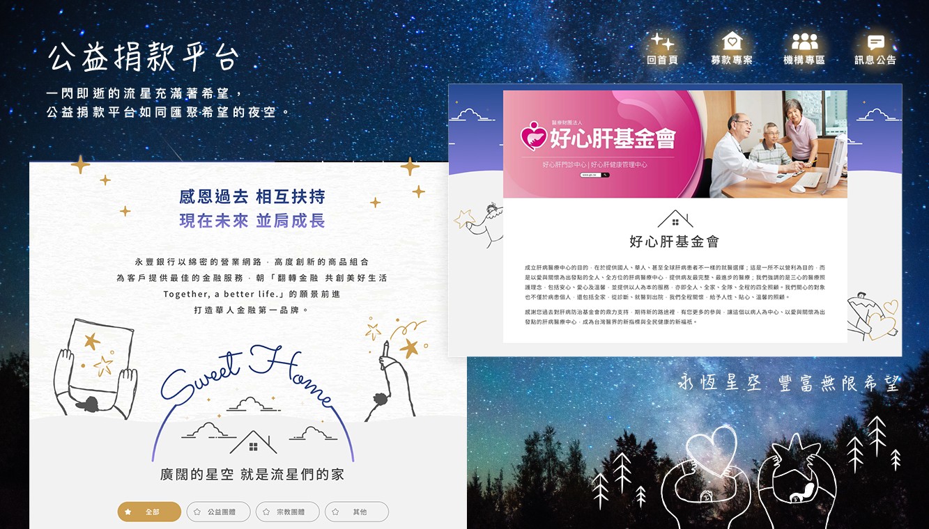 而「永豐公益捐款平台」,如同匯聚希望的星空,每個募款專案都是一顆充滿希望的流星,乘載公益及宗教團體的愛,將愛散播出去。